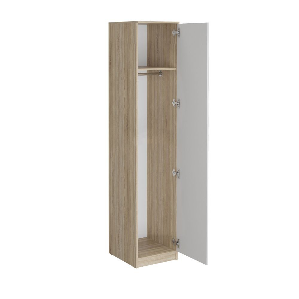 Универсальный пенал с полками и штангой - можно установить все полки и использовать для хозяйственных вещей, можно совместить - и удалив несколько верхних полок, применить штангу для вешалок с короткими вещами или же сделать полностью гардеробный пенал для длинных вещей на плечиках - уставив только верхнюю и нижнюю полку.